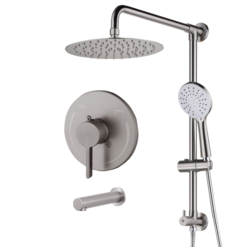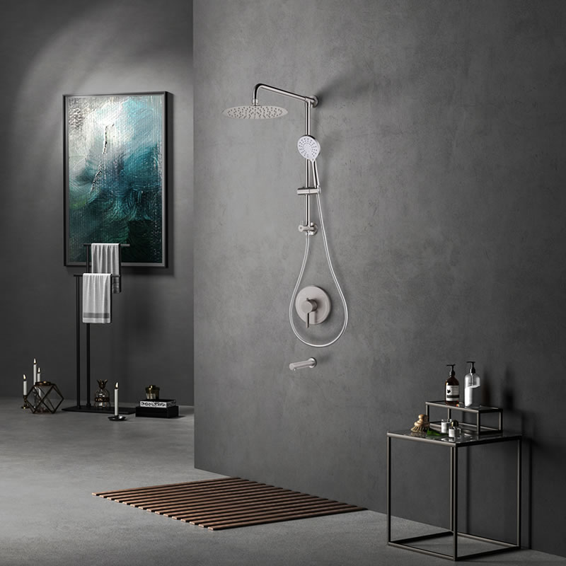 •  This shower system includes stainless steel/plastic rainfall showerhead, premium ABS hand shower, stainless steel extended hose, brass tub spout, solid brass construction and branded pressure balance valve
