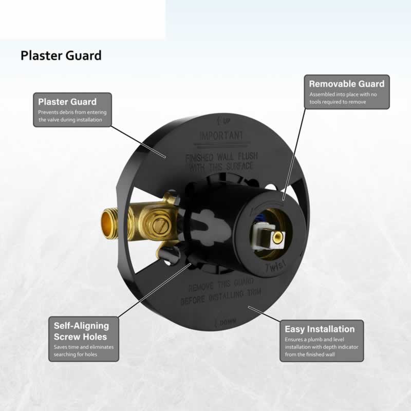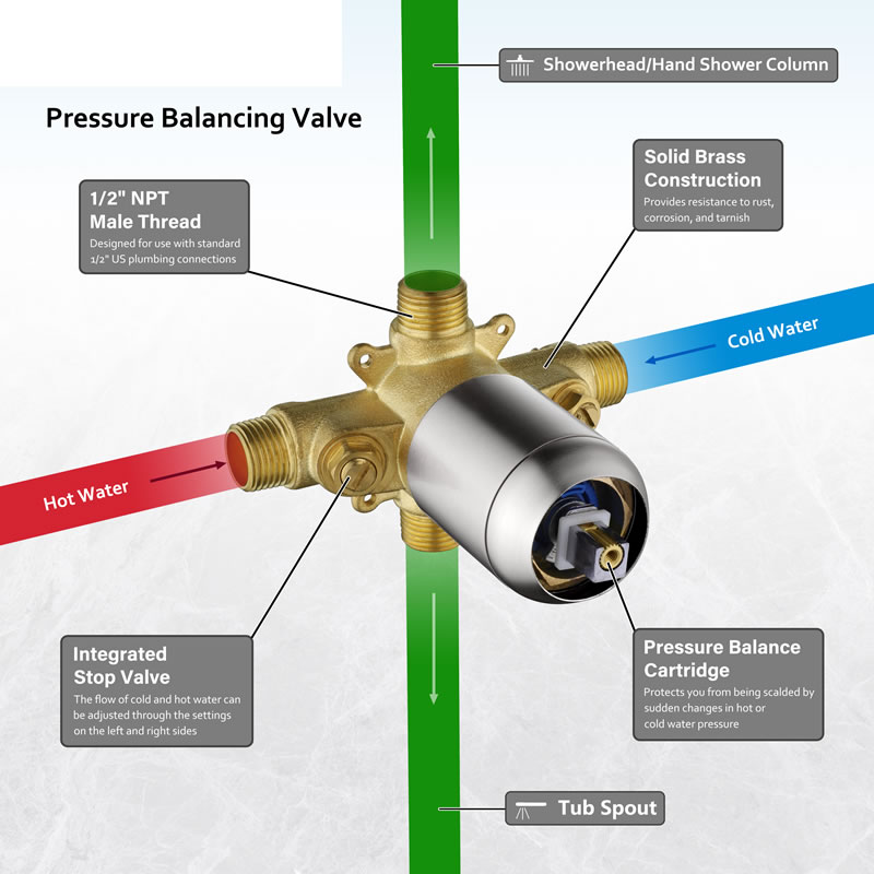 •  PRESSURE BALANCE SHOWER VALVE: Brass valve body with integral stops, the flow of cold and hot water can be adjusted through the settings on the left and right sides, helping to protect you from being scalded by sudden changes in hot or cold water pressure